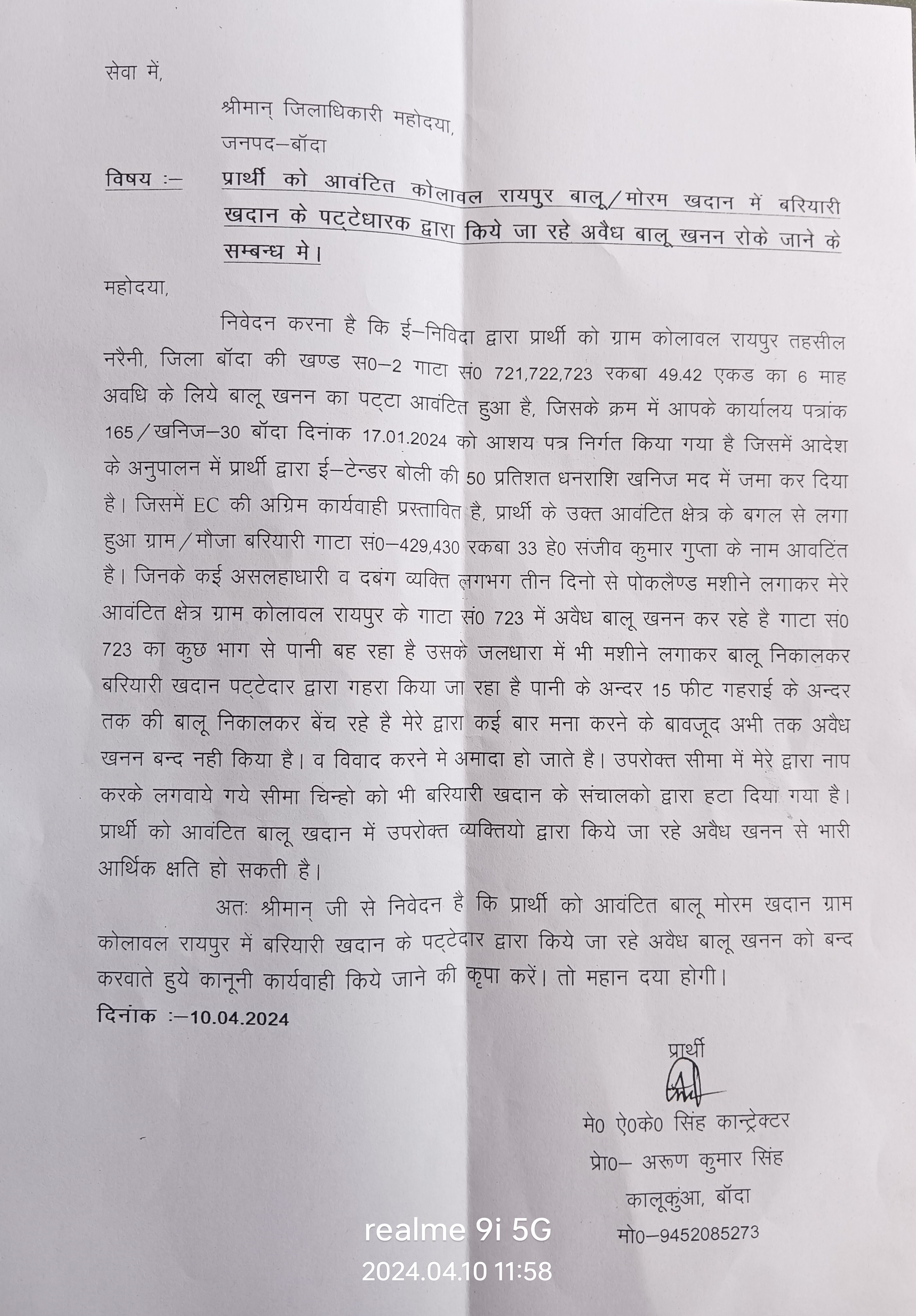 आपको बता दे जिलाधिकारी कार्यालय शिकायत लेकर आए अरुण कुमार ने बताया की बरियारी खदान के बगल से कोलावल रायपुर बालू खदान का पट्टा है जहां बरियारी बालू खदान के गुंडे घुस कर उनके खंड में पोकलैंड मशीनों से अवैध खनन कर रहे है इतना ही नहीं वह लोग नदी की जलधारा से करीब 15 फुट गहराई तक खनन कर जानलेवा गड्ढे बना रहे हैं बार बार मना करने पर नहीं मान रहे है और लड़ने पर उतारू हैं ये लोग लगातार अवैध खनन कर रहे हैं। जिसके बाद जिलाधिकारी ने संज्ञान लेते हुए खनिज इंस्पेक्टर गौरव को भेजा जहां उन्होंने सीमांकन कर क्लीन चिट दे दी उन्हें न ही अवैध खनन दिखा और न ही नदी किनारे खड़ी अवैध पोकलैंड मशीनें दिखीं।
